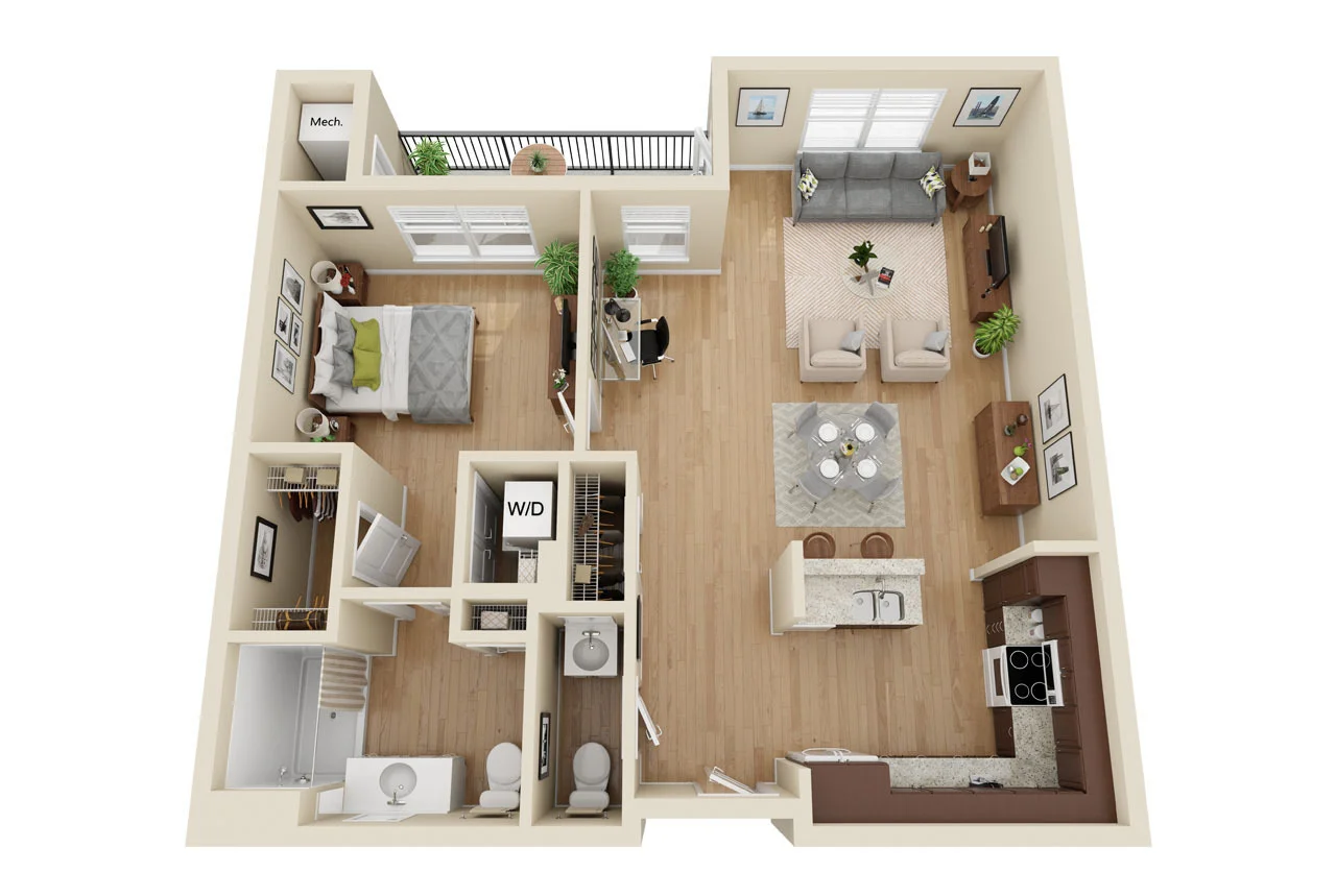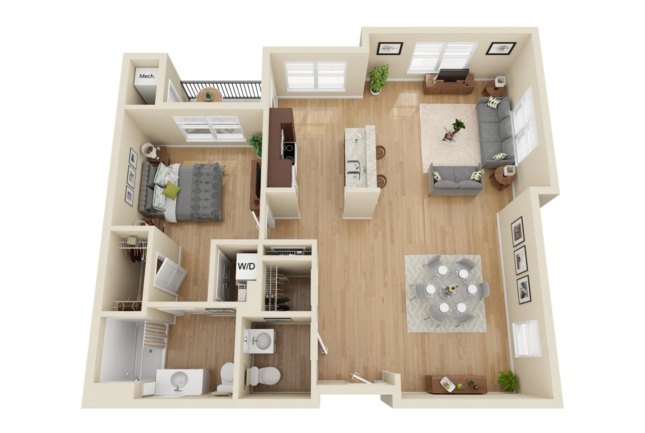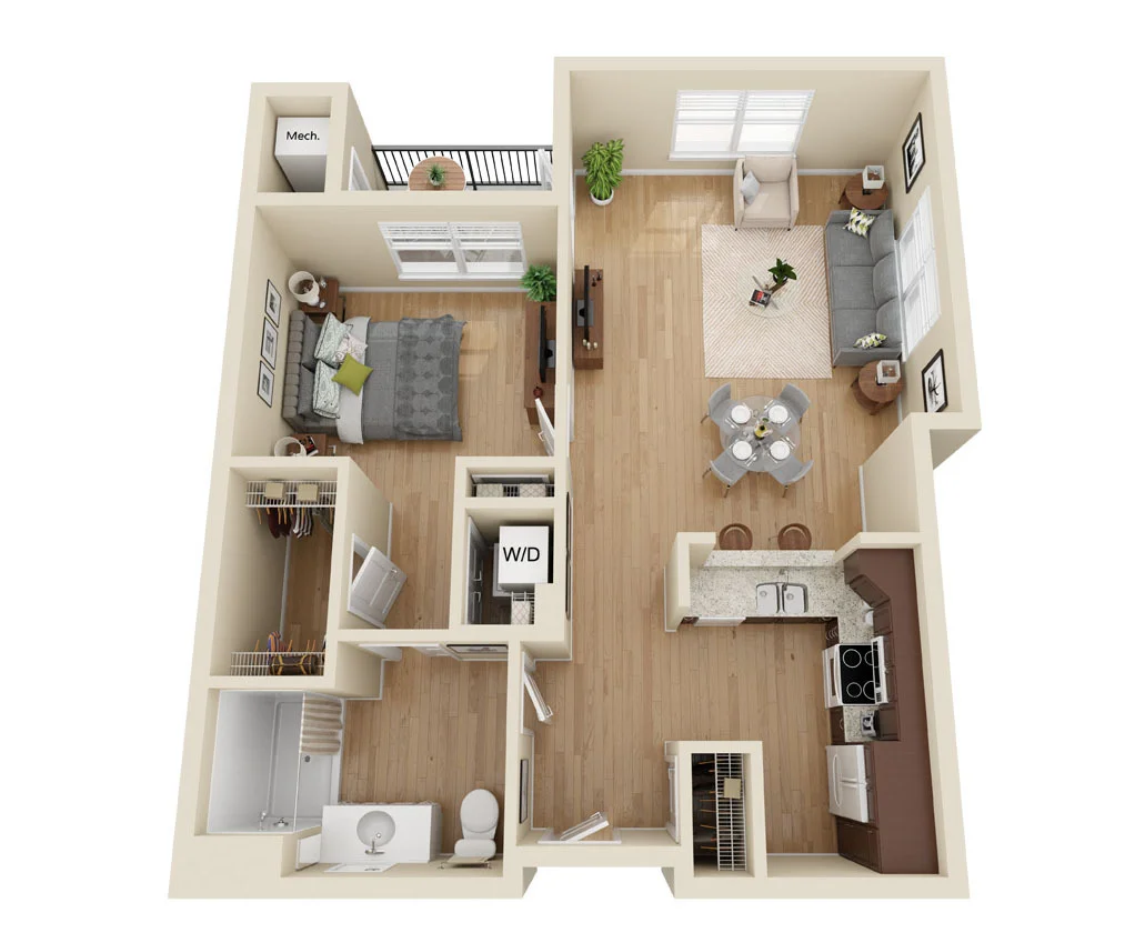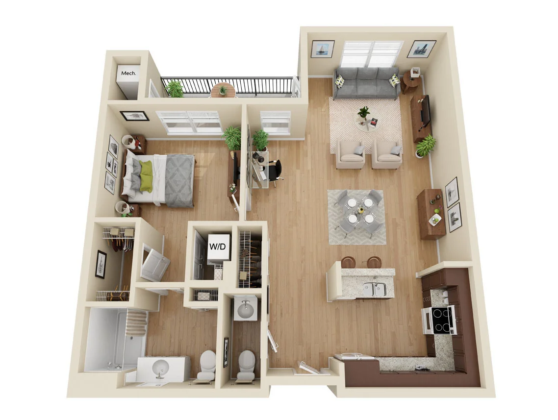 Complete the form below to learn about our Wait List. The Coneflower Bay is our largest one-bedroom apartment. Discover the open, spacious feeling of the dining, living and kitchen areas. Add an optional wall to create a den or office space. The bedroom suite offers access to your private balcony or patio and a full-sized bathroom.
