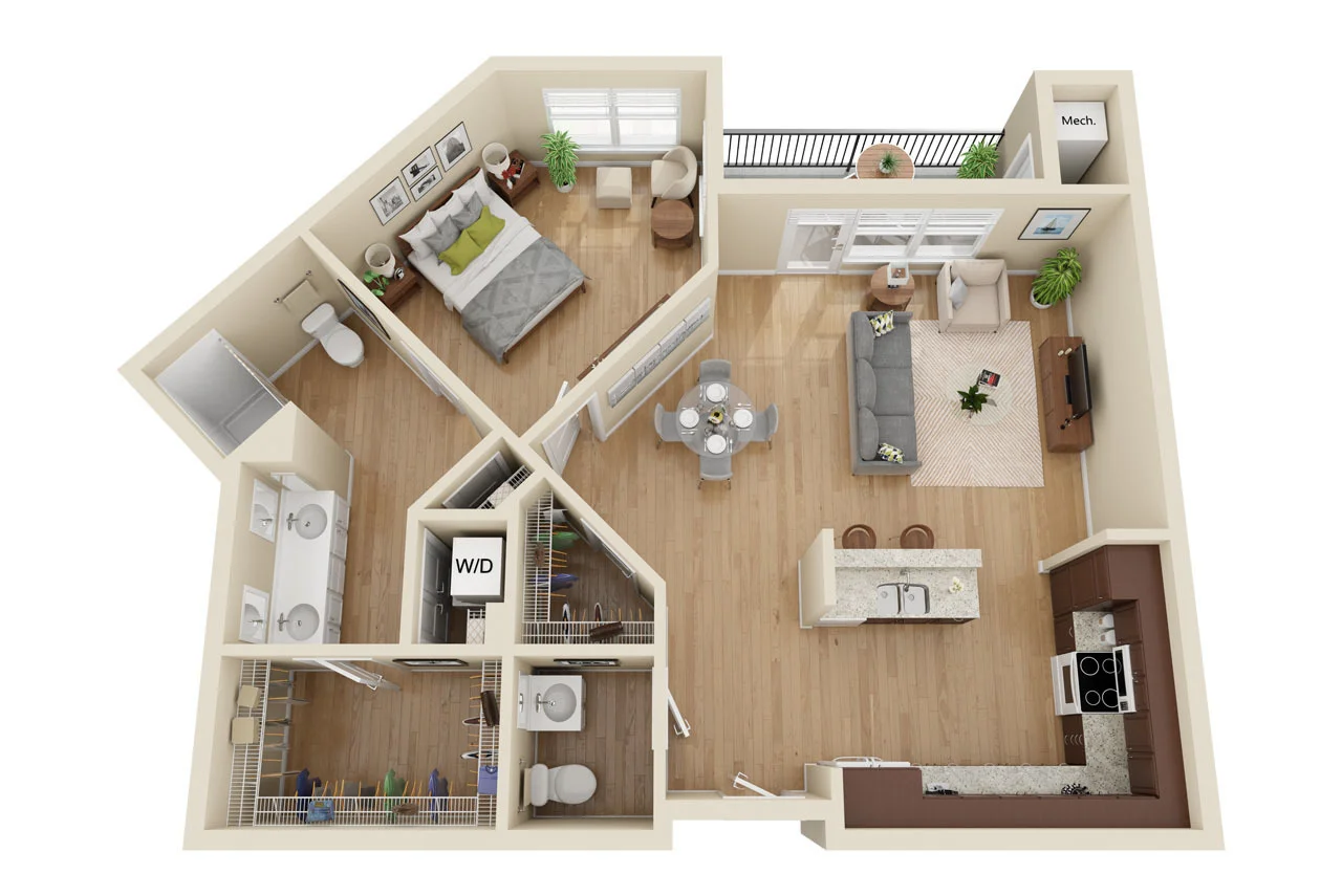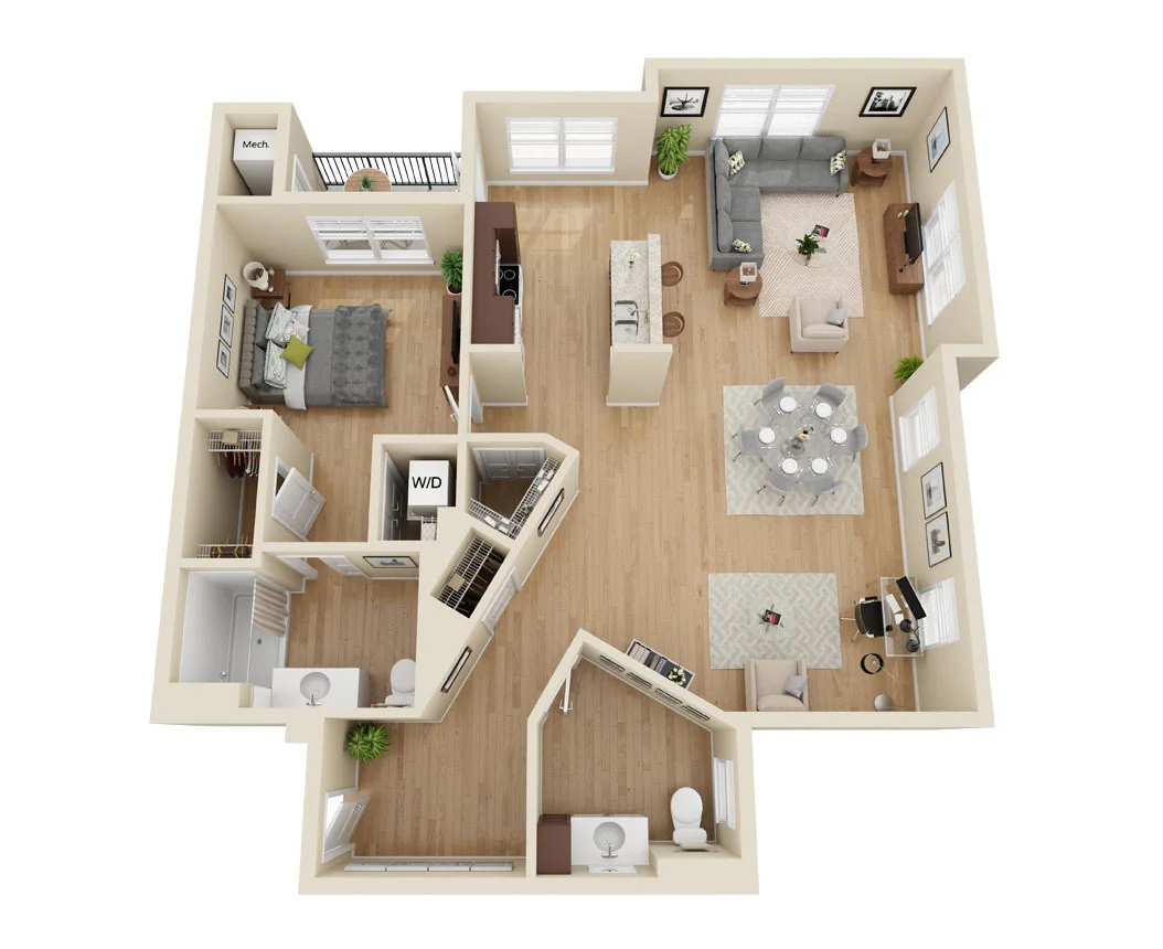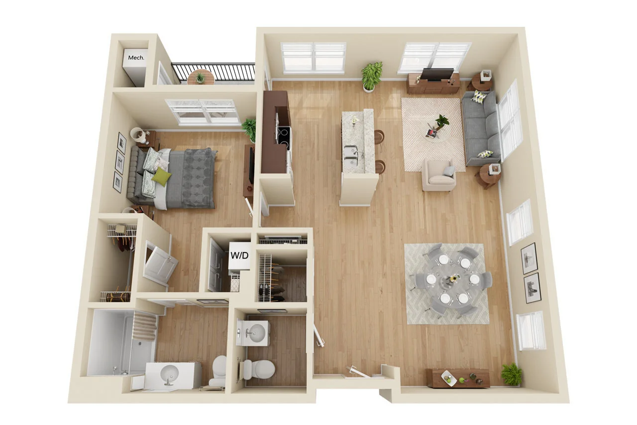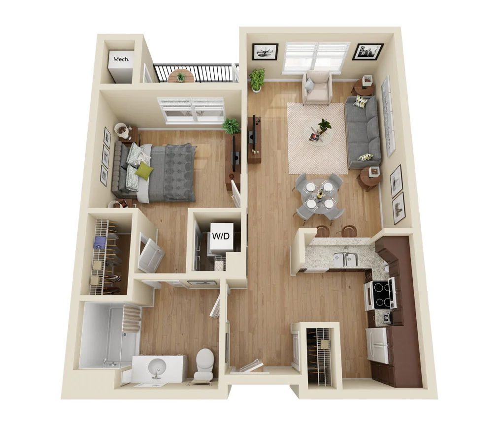 Complete the form below to learn about our Wait List. The Coneflower Bay is our largest one-bedroom apartment. Discover the open, spacious feeling of the dining, living and kitchen areas. Add an optional wall to create a den or office space. The bedroom suite offers access to your private balcony or patio and a full-sized bathroom.