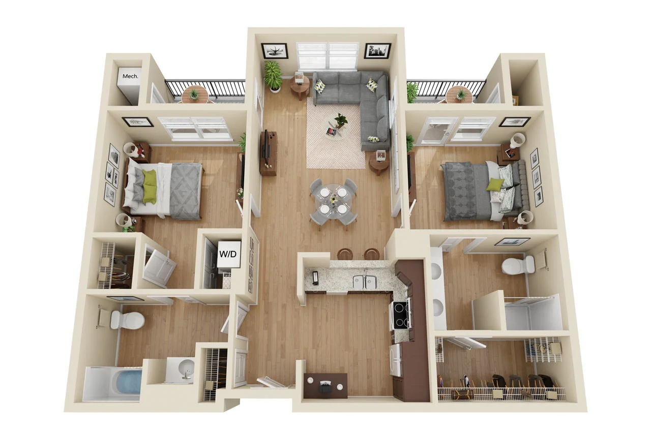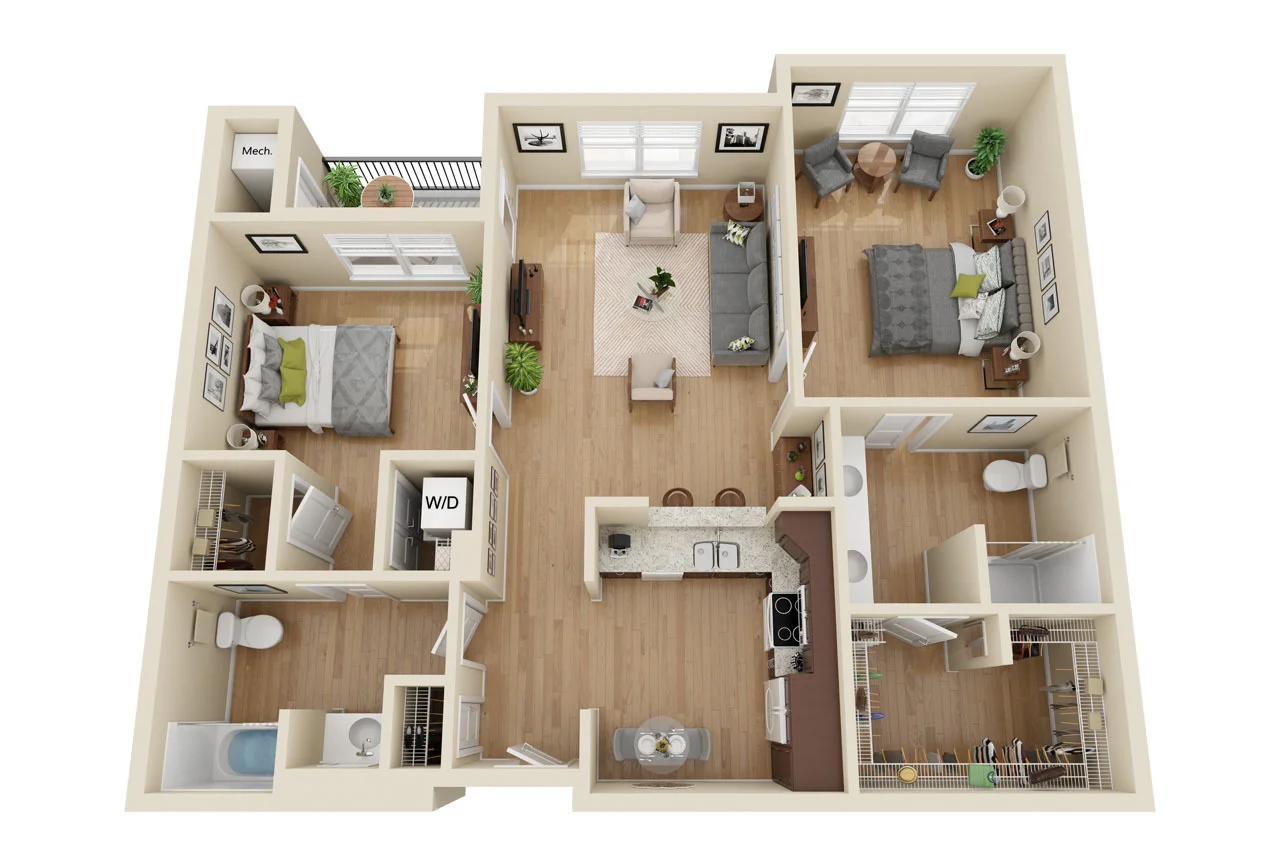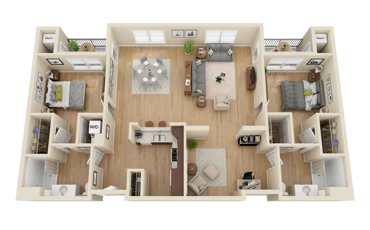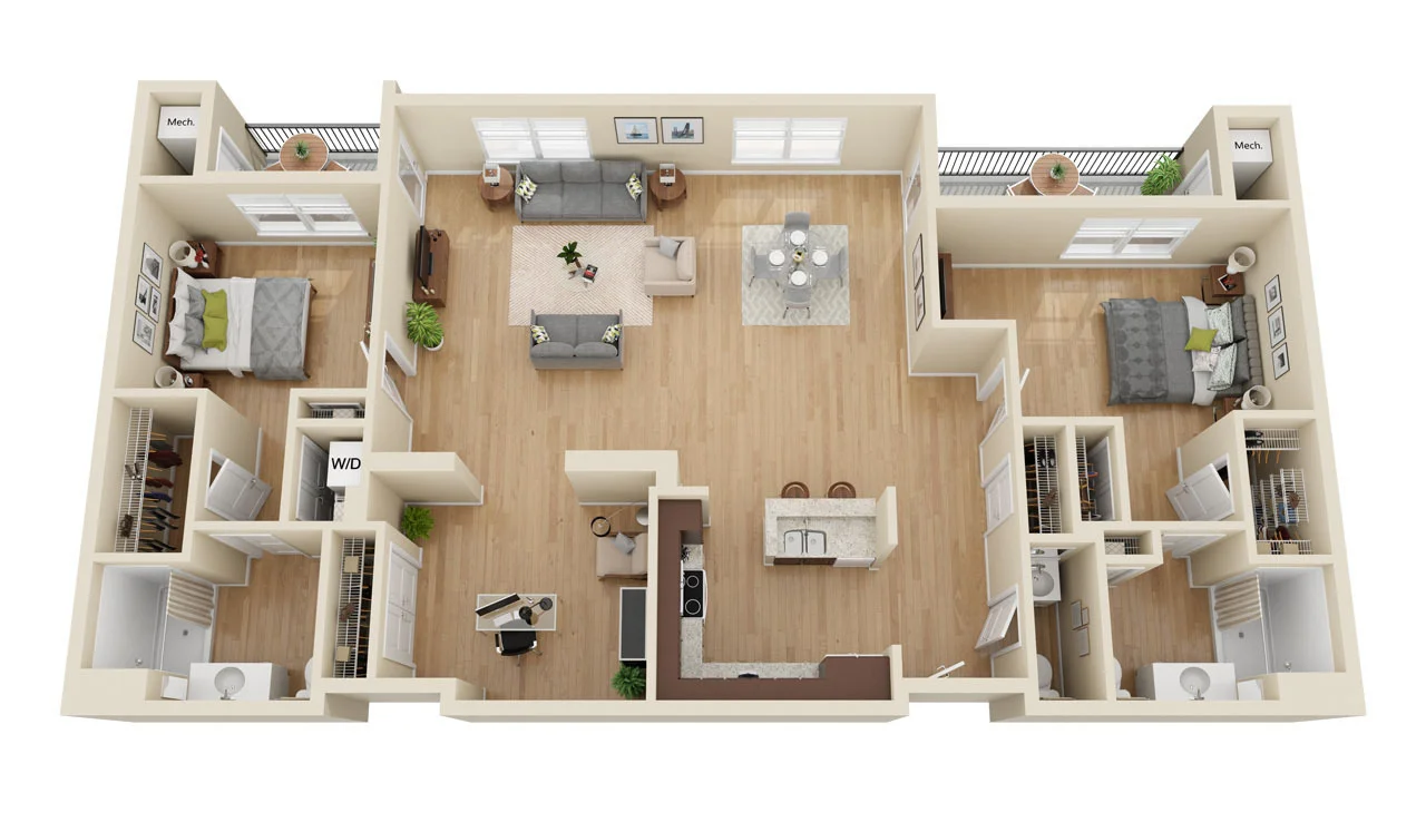 Complete the form below to learn about our Wait List. This 1,200 square foot residence provides great spaces to entertain, spread out and live in luxury. The kitchen opens up into the large living/dining area. The main bedroom includes a full-sized bathroom with dual vanities and large walk-in closet, while the second bedroom shares a full bathroom and has access to a private patio.