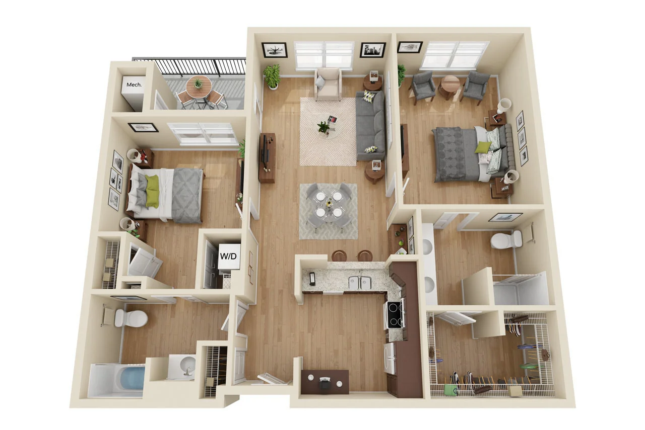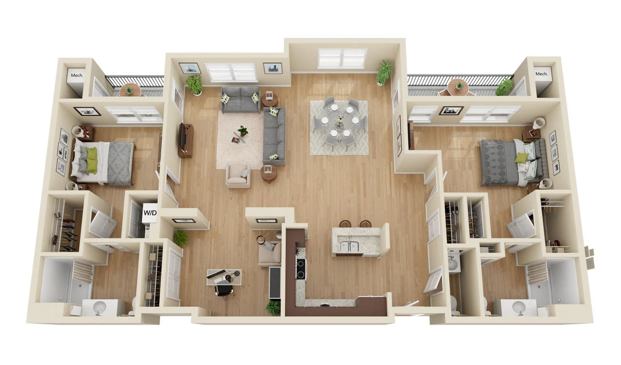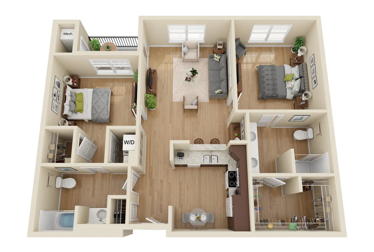 Complete the form below to learn about our Wait List. This 1,200 square foot residence provides great spaces to entertain, spread out and live in luxury. The kitchen opens up into the large living/dining area. The main bedroom includes a full-sized bathroom with dual vanities and large walk-in closet, while the second bedroom shares a full bathroom and has access to a private patio.